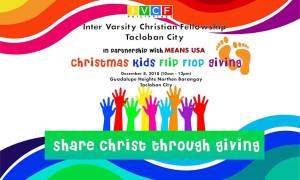 In our partnership with IVCF Tacloban (Eastern Visayas), we aim to help them apply what they are learning from their Bible studies by reaching out to their own community. Since December is the season of gift giving, the timing was perfect! With the support of MEANS, a plan was conceived to distribute flip flops to children at a Haiyan survivors’ relocation community – Barangay Guadalupe in Tacloban City. When a group of graduates, IVCF students and staff went there, the children and parents welcomed them with joy. They taught songs, dances and games. There was food and distribution of flip flops afterwards.